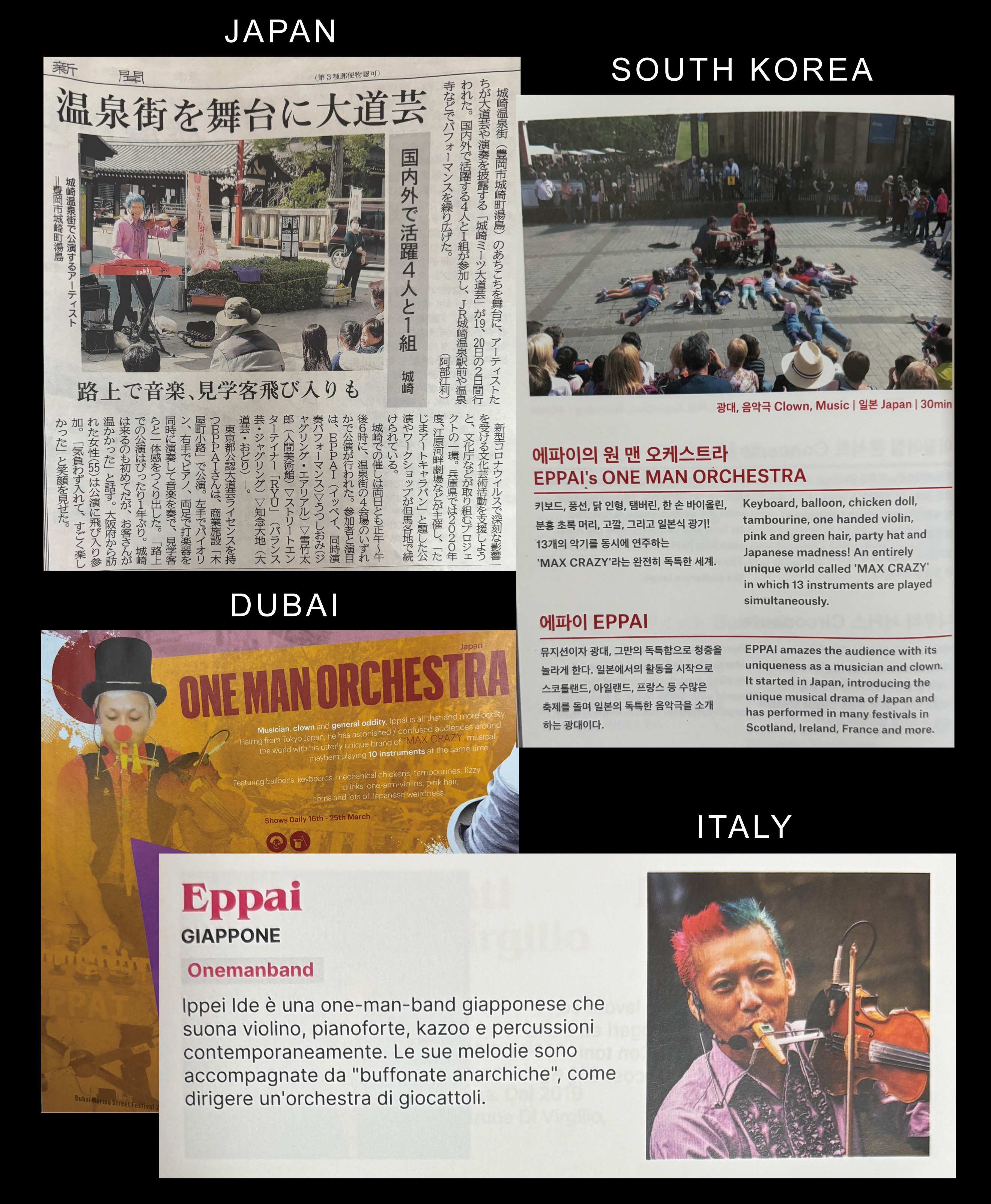 No Street performer in the world does quite what EPPAI does. Musically he plays violin with one arm, piano with the other (already difficult enough) and an assortment of kazoo, drums, etc. with whatever parts of my body are left. All at the same time. Throw a heaping helping of chaotic clowning on top of this and you have an EPPAI performance, sure to keep crowds entirely engaged, thoroughly entertained and completely confused. My performances are 30 minutes long, with roughly 1/3 of the time spent performing music and the remaining 2/3 engaging in various anarchic antics. This could involve conducting an orchestra of children”Ēs toys, juggling and playing the violin at the same time, encouraging children to run round and round in endless circles, audience-participation scream sessions, or any number of other bits of avant-garde clown silliness. It all culminates in a once-in-a-lifetime grand finale human water fountain stunt (hint: beer is involved). Suitable for children 10 months of age to children 130 years of age, for punk-rockers, nuns, and everyone in between. If you need full of my show movie, Please feel free to let me know. ------------------------- Regarding technical matters, -The drums and other percussion instruments used are small, and not very loud. -Can perform on any type of surface, provided there is approximately 2x2m of space. In the case of rain, the space should be covered with a roof. -Audience size can range from more intimate 50 people performances to larger circle shows and stage shows. ------------------------- "Festivals I did attend most recently" Ferrara Buskers Festival (Italy) 2024 Gradi«« fest in Novi Sad (Serbia) 2024 STRAMU in W«ärzburg (Germany) 2024 ANOMALIE in Rome (Italy) 2024 TEVERINA BUSKERS FESTIVAL in Celleno (Italy) 2024 Satu Mare Street Music Festival (ROMANIA) 2022 Abha Festival (SAUDI ARABIA) 2022 Ansan Street Arts Festival (KOREA) 2019 Dubai Marina Street Festival (UAE) 2017 Edinburgh Fringe Festival (UK) 2015, 2016, 2017 FUJI ROCK FESTIVAL (JAPAN) 2013-2025 And I perfomed many busker festivals in Japan 2013-2025 (sancha, koenji, hitachi, atsugi, etc.) |