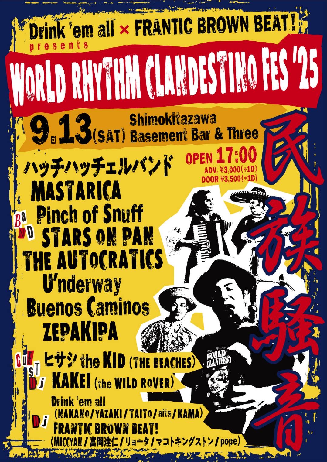ZEPAKIPA 初ライブ!! 2025.9/13 sat. @下北沢 Basement Bar & Three / shimokitazawa (2会場で開催) open 16:30 ZEPAKIPAは、1番目 17:00- @Three -Drink'em all x FRANTIC BROWN BEAT! presents- 『WORLD RHYTHM CLANDESTINO FES '25』 -band- ハッチハッチェルバンド MASTARICA PINCH OF SNUFF STARS ON PAN THE AUTOCRATICS U'NDERWAY Buenos Caminos ZEPAKIPA -Guest DJ- ヒサシ THE KID (THE BEACHES) KAKEI (the WILD ROVER) -DJ- Drink'em all (NAKANO / YAZAKI / TAITO / aits / KAMA) FRANTIC BROWN BEAT! (MICCYAN / 富岡達仁 / リョータ / マコトキングストン / pope) 前売3000yen+1drink / 当日3500yen+1drink -Ticket- yoyaku1999@gmail.com |