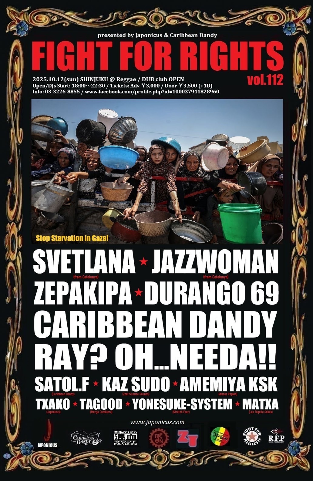 2025.10/12 sat. 新宿 DUB club OPEN / shinjuku Open/DJs Start: 18:00〜22:30 Tickets: Adv 3000yen / Door 3500yen (+1D) -presented by Japonicus & Caribbean Dandy- 『FIGHT FOR RIGHTS vol.112』 出演: SVETLANA (スペイン) JAZZWOMAN (カタルニア) RAY?OH...NEEDA!! CARIBBEAN DANDY ZEPAKIPA DJs: 藤井悟 KAZ SUDO (Zoot Sunrise Sounds) AMEMIYA KSK (discos Papkin) TXAKO (Japonicus) TAGOOD (Monte Bailanta) YONESUKE-SYSTEM (Stretch Four) MATXA (Los Tequila Cokes) -Ticket- yoyaku1999@gmail.com Info: Open 03-3226-8855 / www.facebook.com/profile.php?id=100037941828960 |