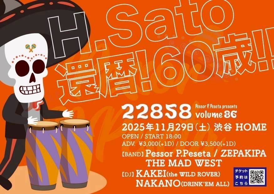 2025.11/29 sat. 渋谷 HOME / shibuya Pessor P.Peseta presents “22858” vol.36 「H.SATO 還暦! 60歳!!」 open/start 18:00 ADV. /DOOR 3000yen (+1D) 【BAND】 Pessor P.Peseta THE MAD WEST ZEPAKIPA 【DJ】 KAKEI(THE WILD ROVER) NAKANO(DRINK'EM ALL) |