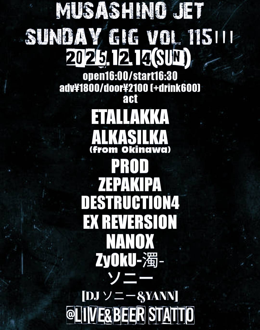2025.12/14 sun. 武蔵境 STATTO / musashisakai 「MUSASHINO JET SUNDAY GIG vol.115!!!」 出演: ETALLAKKA PROD ALKASILKA(from 沖縄) DESTRUCTION4 EX REVERSION NANOX ソニー ZyOkU-濁- ZEPAKIPA [DJ]ソニー&YANN open16:00/start16:30 (予定) 前売 1800yen / 当日 2100yen (+1drink 600yen) -Ticket- yoyaku1999@gmail.com |