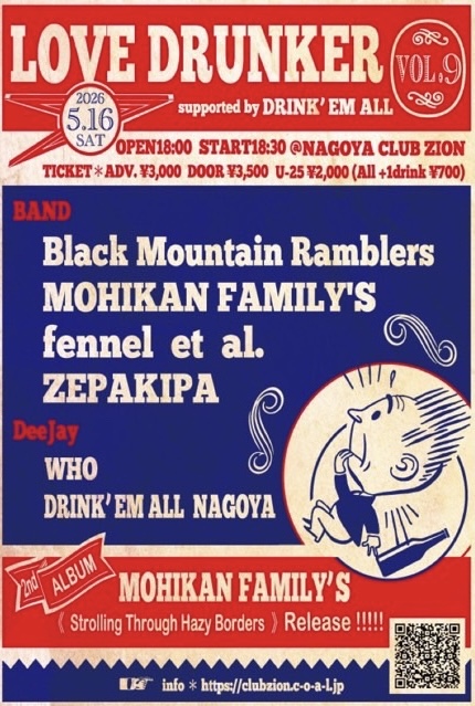 2026.5/16.sat. 名古屋・CLUB ZION / nagoya, aichi OPEN/START 18:00/18:30 【LOVE DRUNKER vol.9】supported by DRINK‘EM ALL MOHIKAN FAMILY’S 2ndレコ発《Strolling Through Hazy Borders》 ? adv 3000yen / door 3500yen U-25/ 2000yen (+1drink 600yen) 【BAND】 ?Black Mountain Ramblers fennel et al. . MOHIKAN FAMILY'S ZEPAKIPA 【DJ】? DRINK’EM ALL NAGOYA WHO 【info】 前売チケット yoyaku1999@gmail.com CLUB ZION https://clubzion.c-o-a-l.jp/ |